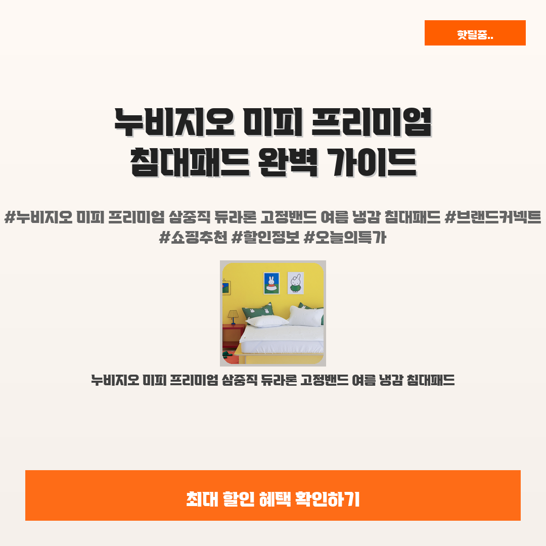 🛍️ 이 포스팅은 네이버 쇼핑 커넥트 활동의 일환으로,판매 발생 시 수수료를 제공받습니다.오늘 소개할 제품은 단언컨데,,바로 누비지오 미피 프리미엄 삼중직 듀라론 고정밴드 여름 냉감 침대패드입니다!여러분도 여름철 뜨거운 날씨에 잠을 이루기 힘들었던 경험 있으신가요? 제 여름밤이 그랬어요. 하지만 이제 걱정할 필요 없어요!누비지오 미피 프리미엄 제품 덕분에 시원하고 쾌적한 잠자리를 만들어줄 수 있으니까요.이 침대패드는 듀라론 소재로 제작되어 냉감 효과는 물론, 삼중직으로 강한 내구성을 자랑합니다. 마음껏 사용해도 후회하지 않으실 거예요!소중한 수면의 질을 높여줄 이 놀라운 제품은, 가성비까지 뛰어나니 더욱 매력적이죠.여러분도 행복한 잠자리를 경험해 보세요. 여름철 필수템으로 강력 추천합니다!누비지오 미피..